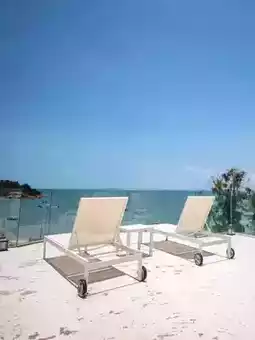 The oversized floor-to-ceiling windows offer panoramic views of the blue sea and sky