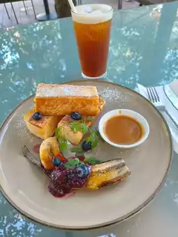 I ordered their ice peach tea and French toast with banana and blueberries, and it was the perfect combination of refreshing and indulgent. The French toast was crispy outside, soft inside, and paired so well with the fresh fruits and syrup.