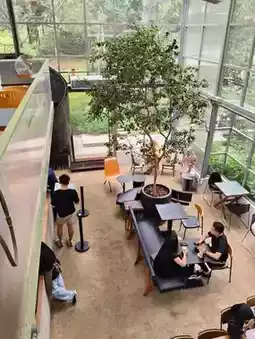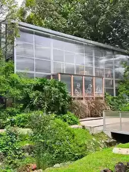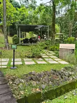 Glasshopper cafe, located in the Putrajaya Botanical Garden. It is a glasshouse cafe surrounded by lush greenery, offering both indoor and outdoor seating. The cafe is known for its modern, minimalist design and serene atmosphere, making it a popular spot for relaxation and photo opportunities. It is located at Presint 1, 62000 Putrajaya and is open Tuesday through Sunday. The cafe is popular among locals and bikers and is known for its friendly staff and good food, including pastries, Western and local dishes.