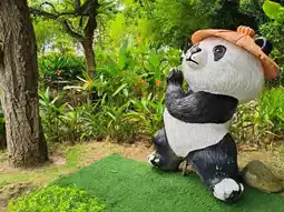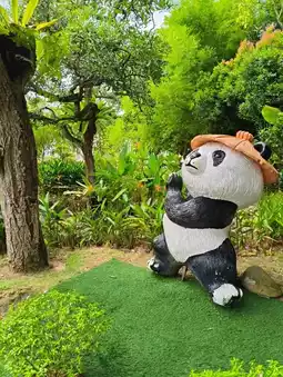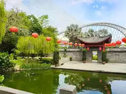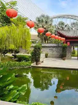 - The garden features a mix of Chinese-style rock gardens, bonsai trees, and Malaysian tropical plants.