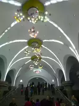 Pyongyang Metro, with a depth of 100 meters, has a very long elevator tunnel. When you arrive at the waiting platform below, it is a spacious place with murals on the walls and chandeliers hanging from the ceiling, similar to Soviet architectural style.