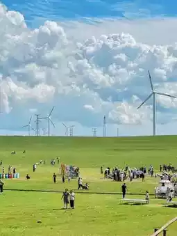 The scenery after the rain was exceptionally beautiful. Clouds spread freely across the sky, wind turbines turned lazily in the distance, cattle and horses strolled leisurely on the fresh greenery, lakes reflected the clouds, and the scent of grass mixed with the moisture in the air—everything felt just right.