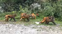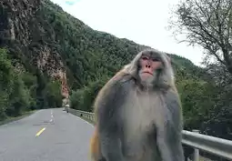 It is not uncommon to see herds of cattle and sheep strolling leisurely on the Sichuan-Tibet Highway. Today, I encountered a group of macaques on National Highway 317 in the Jiangda Nature Reserve. A large family of more than a hundred people, young and old, came in groups (Figure 3), and all the vehicles stopped to give way. Two monkeys even jumped onto our hood. One of them looked like the monkey king (Figure 4), showing off his authority as the "master" and repeatedly peeking into the car. Our honking was ineffective. After more than a minute, they left in disappointment when they saw that they could not receive any "bribe".