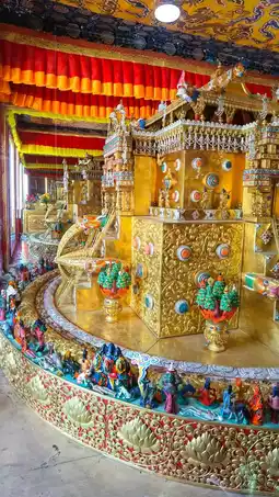 When we entered, the temple was almost closed and there were very few tourists. We moved freely through various halls, such as the main hall - the Great Sutra Hall (center), the Dharma Protector Hall (right), and the Tara Hall (left) located on the north side of the Jampa Ling Monastery Square (Figure 5). On the upper floor of the Great Sutra Hall, we saw the exquisite "mandala" (Figure 6). In the Zankang Hall (Figure 7), we saw monks chanting sutras and about to have dinner (not convenient for photography), as well as the Tsokchen Hall (Figure 8), Gaden Tangchen Phodrang (Figure 9), etc.