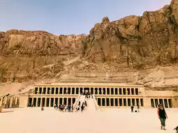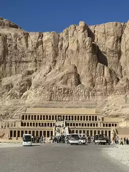 Beat the heat and crowds by arriving at **Deir el-Bahari** at dawn, when the rising sun turns the temple’s terraces gold and the desert breeze still carries the night’s coolness. This 3,500-year-old masterpiece looks like it was carved from the cliffs themselves!