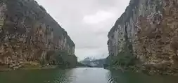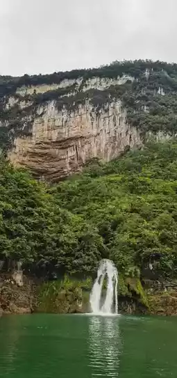 At dawn, as the lingering haze disperses, the gallery unfurls its beauty under the morning light. The jade-like waters of Dongfeng Lake stretch like polished gemstones, mirroring the crimson cliffs carved by nature’s chisel. Vines cascade from the rocky folds like natural tassels. Gliding by boat, the silver wake entwines with valley mist, while the Liuguanghe Waterfall hangs like a silken ribbon, its plunge into the lake scattering a thousand glistening droplets—eternalizing the praise *"mountains rival the Three Gorges, but its waters surpass them"* in rippling light.