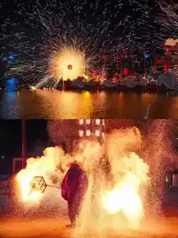 There are also intangible cultural heritage fire pots, Wa ethnic fire spitting, iron flower forging, and fireworks shows.
