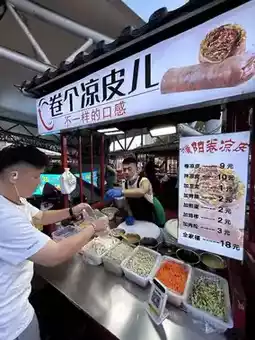 You will find lots of different types of food from local specialities like marinated raw seafood to rarer finds like 凉皮卷。
