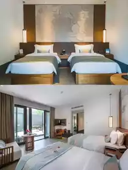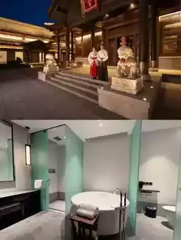 Hotel environment: The hotel is located in the southeast corner of Jimo Ancient City Scenic Area. Before entering the hotel, the gate is decorated with green pines and imitation zither stones ❤️, and the hotel and the ancient city complement each other. Walking into the Wanshou Palace, you will find that the pillars inside are all made of solid merlot wood, with a cost of about RMB 11,000 per square meter. The stone drum doorposts on both sides of the lobby entrance are made of white marble, which means to protect the house and ward off evil spirits. New falling wind chimes are added on both sides of the stairs to better alleviate the dripping of rain on rainy days. ✔️In ancient times, wind chimes were hung in front of the doors of mansions. The quiet and clear sound of wind chimes represented peace and harmony✔️. Wind chimes can also be used as Feng Shui decorations to attract noble people and nobles, so they are also called noble wind chimes✅. The orchid stone carvings on the wall behind the wind chimes highlight the elegance of the hotel. The hotel's foyer and lobby are also very spectacular, resembling an ancient palace.