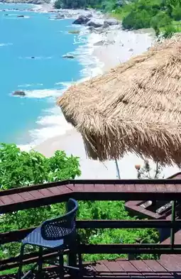 Walking down the steps, you reach the popular cliff terrace, and further down is a white sandy beach 🏖