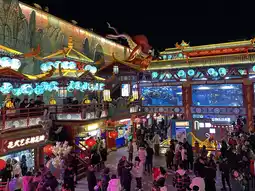 Qingdao's Mingyue Shanhai Jian Night City is a complex cultural tourism site themed on the mythological world of Shan Hai Jing, a nighttime attraction combining tradition and modernity. It has streets themed on the four divine beasts of the Red Bird, the Azure Dragon, the White Tiger, and the Black Tortoise, four large stages, 17 art performance spaces, and over 20 kinds of amusement rides and various themed performances. In addition, it is a popular place for gourmets because you can enjoy various street foods from all over the country and abroad.