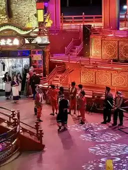 Action artists suddenly appear and perform dance, magic, and Chinese-style shows