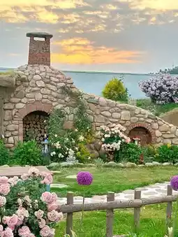 As you turn a corner, you’re suddenly greeted by a courtyard overflowing with roses and a sea of lavender-blue blooms, painting the mountainside in romantic hues.
