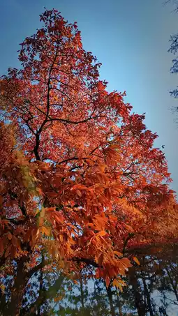 ▪ To the left, there is a towering tree with orange-yellow leaves.