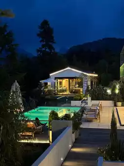 The private hot spring pool is a must at night!🛁 Under the starry sky, in the steaming water vapor, we chatted about secrets, feeling like time stood still...✨ Looking up, the Milky Way is right there, the stars seem within reach!