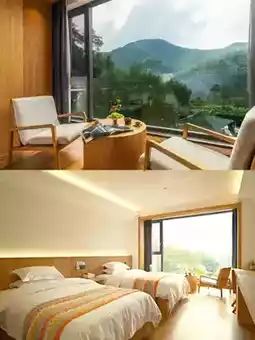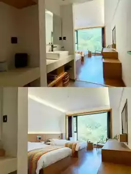 • The room features a minimalist natural wood style, with two beds facing the entire floor-to-ceiling window. You can see clouds wrapping around the mountain waist as soon as you open your eyes in the morning (remember to set your alarm to catch the sunrise light and shadows!)