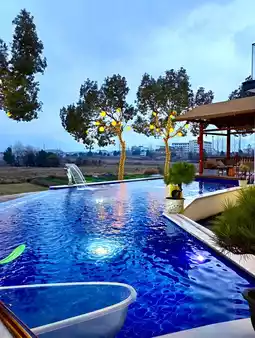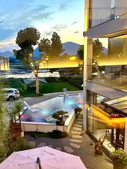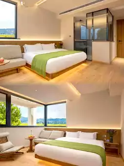 Hidden in the courtyard is a stunning infinity pool with crystal-clear water, blue and gem-like. During the day, soaking in the pool with green mountains overhead and a cool breeze feels like a Bali vacation. In the evening, warm yellow lights light up around the pool. Sitting by the pool with a cold drink, watching the sunset paint the sky orange and pink, creates a perfect romantic atmosphere for couples!