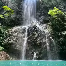 Below the waterfall, a clear pool of water is gathered, like a natural mirror, reflecting the green and even mountains and lush vegetation around it, which is extremely peaceful and peaceful.