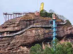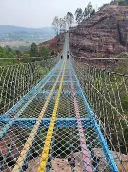 The iron rope bridge is 163 meters long and built on the Danxia red cliffs at an altitude of 179 meters, connecting the Danxia mountains on both sides. The bridge deck is covered with steel wire mesh, and it is suspended on all sides, connecting the mountains and flying into the sky. If your body allows, you can experience the thrill and excitement of "walking on the bridge, chasing the soul behind" on the bridge.