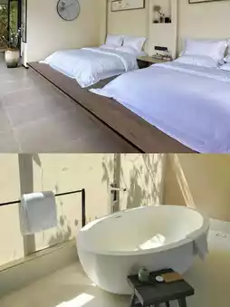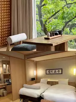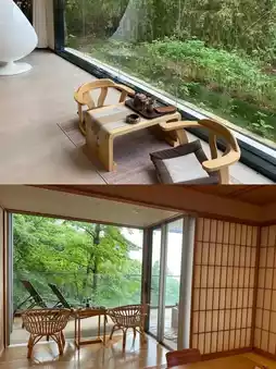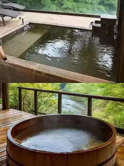 The private hot spring pool is decorated in a natural style, creating a great atmosphere 💯 It's perfect for a family to soak in the hot spring ♨️ It's so warm and cozy