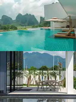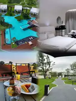 House layout: 3 bedrooms and 1 living room, no kitchen. Among them, the room on the first floor is a double room. The room on the second floor is larger and can see the swimming lane. It has two 1.5m double beds. The other room is smaller and cannot see the swimming lane. It has two 1.2m beds.
