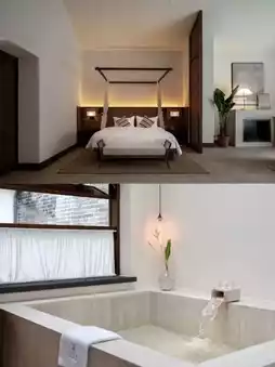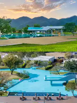 For Sankeng Town Hot Spring, I recommend the Quanxian Hot Spring 🏨. The black and white minimalist design is my favorite style. Each villa has a hot spring 🧖 and direct access to the pool. You can also play on a glass boat and paddle board, which is a lot of fun.