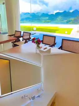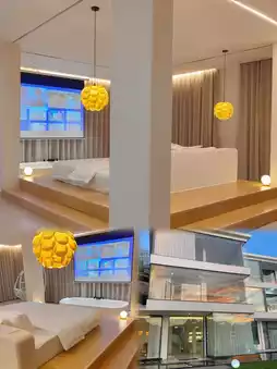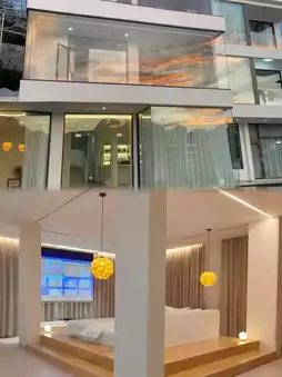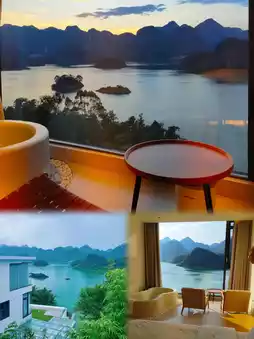 Located by Taohua Lake in Qingyuan, Guangdong, the hotel faces the lake, and the karst mountains on the other side of the lake are reflected in the clear and tranquil water. The mountains and water blend together like a painting. Each room has a panoramic view of the beautiful scenery and is equipped with a swimming pool, fully automatic curtains, smart toilet, 5-star mattress and bedding, double sink, and more.