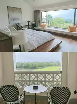 The room has a large glass window, and it looks like an oil painting at a glance. There is a private hot spring pool. It is really comfortable to take a private bath. It is suitable for relaxing here.