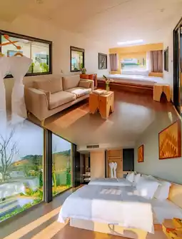 The resort has a really diverse range of room types. Each room is equipped with a private courtyard and private hot spring bath. The special facility, the Starry Sky Gate, is outstanding for taking photos and checking in. Some room types also have oversized floor-to-ceiling glass windows and large gardens. Waking up in the morning to the sunshine and the sound of birdsong makes you feel healed.