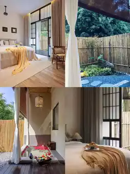❷ Mountain View Private Hot Spring Room | Private courtyard with rose petal bath, stargazing with white tea at night, and fireflies twinkling outside the bamboo curtain