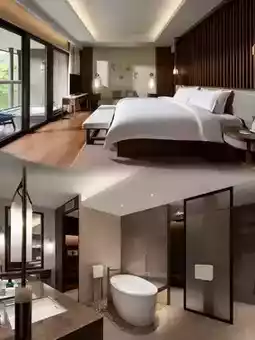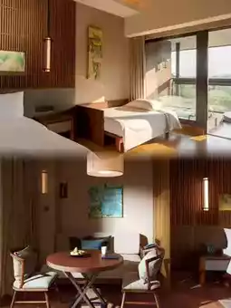 Qingyuan New World Hotel features rooms with Italian-imported gray-veined marble flooring, dual-sink bathroom vanities, and toiletries from a niche French aromatherapy brand. The 180-degree panoramic balcony comes with a private hot spring soaking tub - perfect for enjoying sunset views while bathing as golden light gilds the distant mountains.