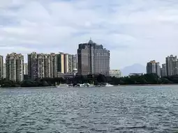 The riverside greenway on the north bank winds along the shore like a green ribbon. Camphor trees, banyans, and kapok trees create a patchy shade, their dense branches intertwining into a natural canopy. On the benches beneath the trees, elderly people rest with eyes closed, children chase and play, and cyclists ride through against the wind. Laughter and the sound of wheels blend into the river breeze. At the end of the greenway, several quaint pavilions can be faintly seen, contrasting with the scattered modern high-rises in the distance, sketching a cityscape where tradition and modernity merge.