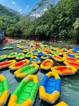 Gulong Gorge rafting, the most attractive, exciting and fun canyon rafting in Guangdong. Gulong Gorge is located in the mountains in the north of Guangdong province, integrating waterfalls, deep pools, jungles, rare plants and so on. The current of gulong Gorge rafting point is swift, silver waterfall splashing, and the drop is huge. Just looking from the top, we can feel its breathtaking and exciting. The gulong Gorge, known as the "forest tunnel". there are a lot of things to do at this place. hiking, glass bridge, glass walkway, rafting, farm, and a lot.