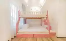 The room details hide clever touches. The muted Morandi color palette creates an ultra-gentle ambiance, while the plush bedding and matching throw pillows make it impossible to get out of bed. A cozy nook by the window, complete with a rattan side table and cushions, invites relaxation. Draw back the curtains during the day, and sunlight streams in—perfect for sipping tea, flipping through a book, and letting the sound of rustling leaves become your background music.