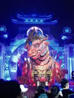 🔵 Nine Dragons Show: A touchable Eastern mythology spectacle, featuring a 40-ton mecha with 72 bionic joints—the first of its kind in China—plus hyper-realistic facial expressions, water mist, and stunning light effects.