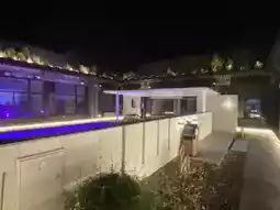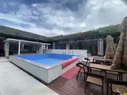 The exterior exudes the elegance of Chinese architecture, with flying eaves, gates, and elegant couplets framing the garden.  Pavilions and trees adorn the courtyard, and at night, soft lighting subtly highlights the garden's contours, creating a mystical atmosphere.