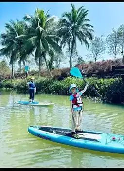 I used to think paddleboarding was a "water balance challenge," but only when the paddle first sliced through the river did I realize that paddleboarding here feels more like stepping into an immersive natural theater. The current is gentle, lightly rocking the board; looking down, I could see schools of small fish chasing the paddle tip in the clear water. Occasionally, a few palm-shaped leaves drifted down, twirling at the board’s edge before floating along the ripples toward the distant greenery.