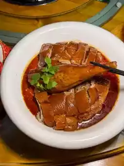✨ The hot spring roast goose is a must-try! Roasted over fruit wood, the skin is glossy and red, with a crisp, almost flaky crunch. The goose meat is incredibly tender and juicy, and the aroma of fat explodes in your mouth without being greasy. Try the hot and cold method—dip it in the scalding marinade and then simmer it in icy ginger for a truly divine experience.