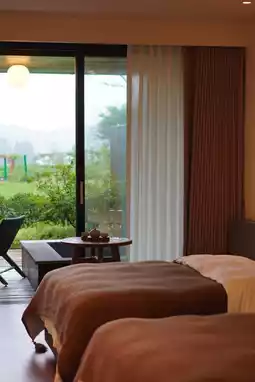 The private hot spring rooms are a must-try! Each room has its own pool with views of tea mountains and sea of clouds. The mattresses and bedding meet five-star standards, and even the slippers are luxuriously soft. The gym and mahjong room are thoughtful additions, ensuring fun for the whole family 🎲