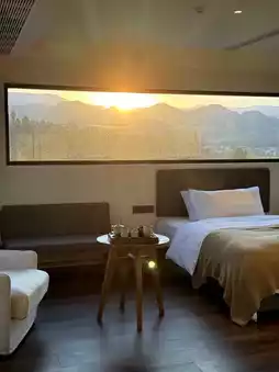 The terrace pools on the second and third floors face the tea mountains directly, soaking at dusk while watching the sunset dye the tea leaves red, with the air filled with the scent of tea.