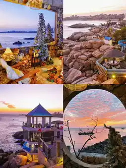 1️⃣5️⃣ Golden Coast: View the sea and Luojiang Temple, with the rocks, beach, and temple creating a stunning photo