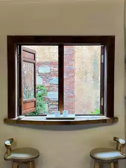 The wooden furniture and the red brick tiles with green plants complement each other 🌿