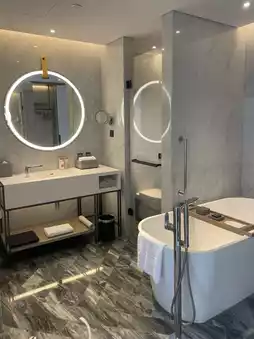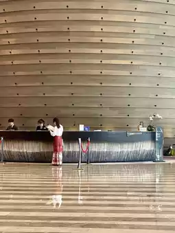 The hotel is by the river, very close to the old town. The hardware facilities are very good. It is a five-star hotel that has only been open for a few years. It is very beautiful, and the lobby is beautiful.