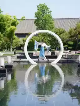 The entire hotel features a courtyard design, with every brick and tile exuding a rustic charm. In the lobby, the hollow ginkgo tree shape is uniquely ingenious, with famous quotes from the "Analects" hidden between the bark textures. The lecturing statue on the side seems to travel through thousands of years, telling you the wisdom of the sages. Change into a flowing Hanfu dress, stand next to the hollow ginkgo tree in the lobby, and let the "Analects" characters be the background, showing an elegant temperament in every gesture. Leaning against the semi-circular white jade gate, you can see the reflection in the water outlining the auspicious sign of "Fu Lu" (fortune and prosperity), and every photo you take is an ancient-style blockbuster. Strolling along the inkstone waterscape, your clothes fluttering in the wind, perfectly interpreting the artistic conception of "the highest excellence is like that of water."
