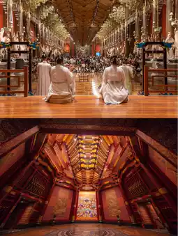 ✨VR immersion is next-level~Put on glasses to "touch" the 72 Sages Corridor sculptures, with caisson ceilings swirling above—mind-blowing🤩