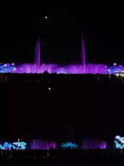 The fountains at Sacred Water Lake change shapes with the music, accompanied by brilliant fireworks blooming in the dark night sky. The interplay of light, water, and fireworks decorates the night in a dazzling display.