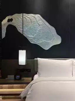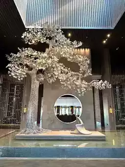 The hotel lobby uses a modern approach to interpret Confucian culture. The design is inspired by the apricot altar lectures and the story of Confucius’ son passing through the courtyard. The metal-cut ginkgo tree trunk is filled with characters from the Analects, and the statue under the tree is Confucius. Watching the koi swim back and forth, staying here for a while improves your whole aura.