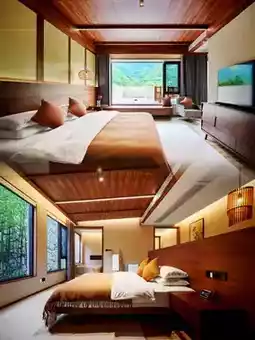 Take a hot spring bath in an independent courtyard ♨️Open the window to see the lush bamboo forest. Whether you are lying on the bed or in the pool, it is a beautiful scenery! The steamy hot pool soaks your body and mind, and you can enjoy a rare relaxing time.