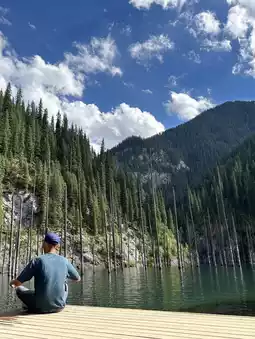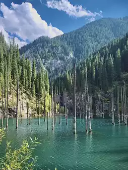 To get there, I had to hike for about an hour in the mountains of Kazakhstan. This unique lake is famous for its submerged forest, where towering tree trunks rise from the water’s surface, creating a magical scene. Formed by an earthquake in 1911, the lake is a vibrant turquoise color, making it a popular spot for photographers and adventurers. 🏞️ It's located in the Tian Shan Mountains, surrounded by breathtaking landscapes. While you can hike around the area, uou can also enjoy picnics, or even go kayaking in the summer.