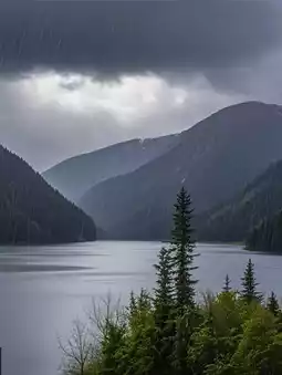 Fine rain falls, and ripples spread across the lake, like countless lively notes. In the distance, mountains loom through the mist, like fairies wearing thin veils, adding a touch of mystery. The rain washes the forest, making it even more lush and deep. Crystal-clear water droplets hang on the pine needles, reflecting colorful light.